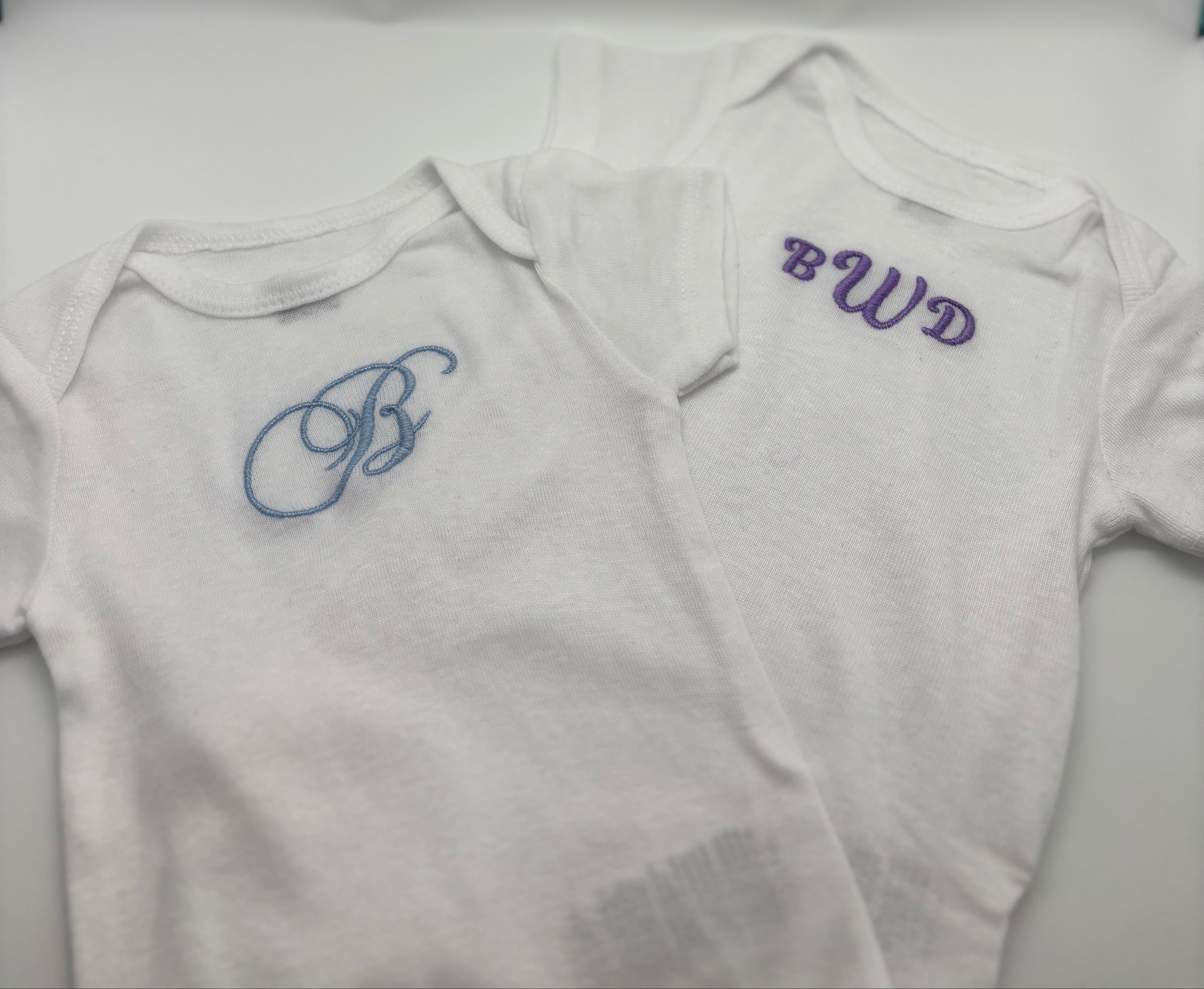 Customize your child's clothing with our embroidered baby onesies and outfits. Personalize with names, monograms, or charming images.