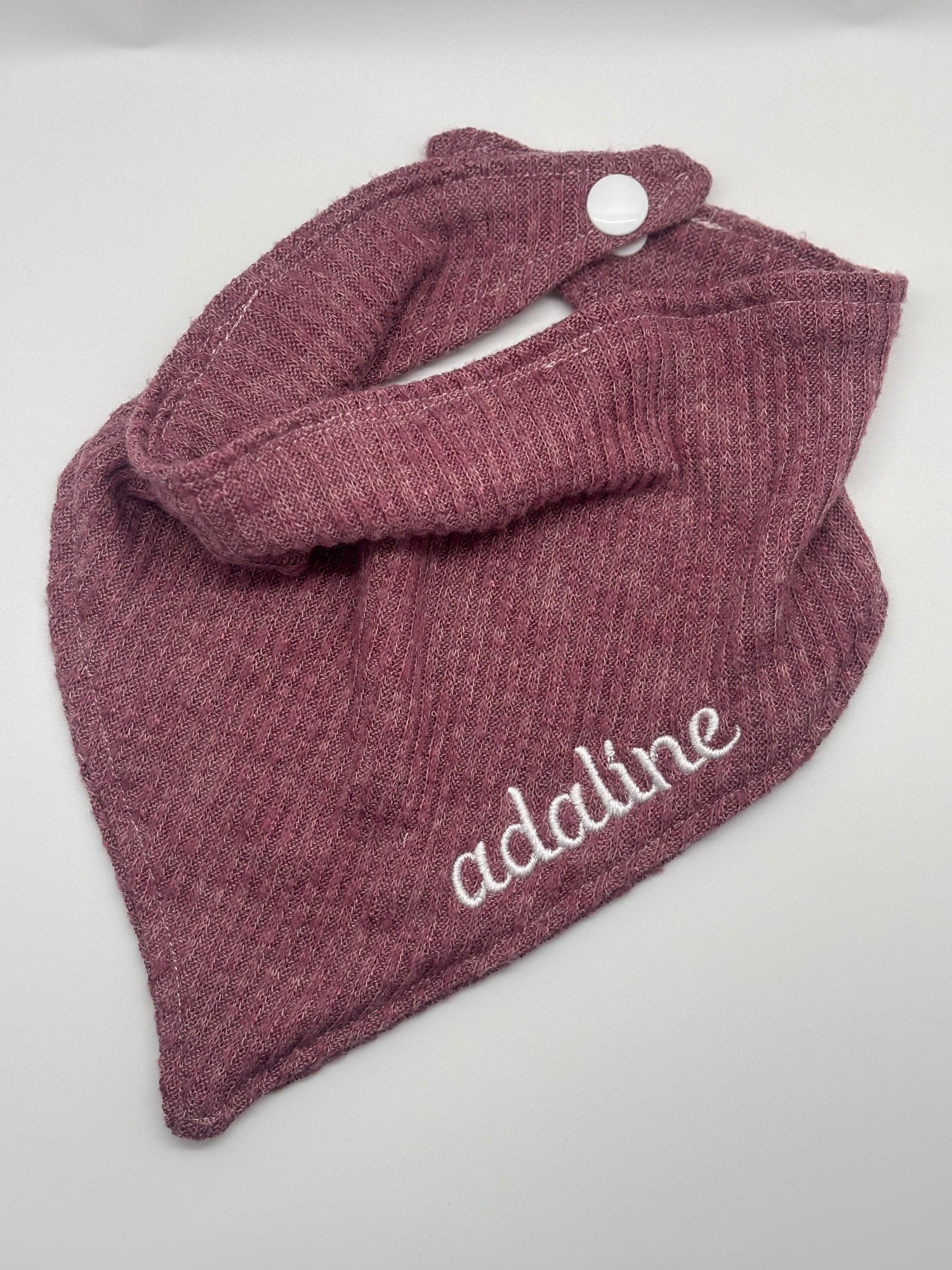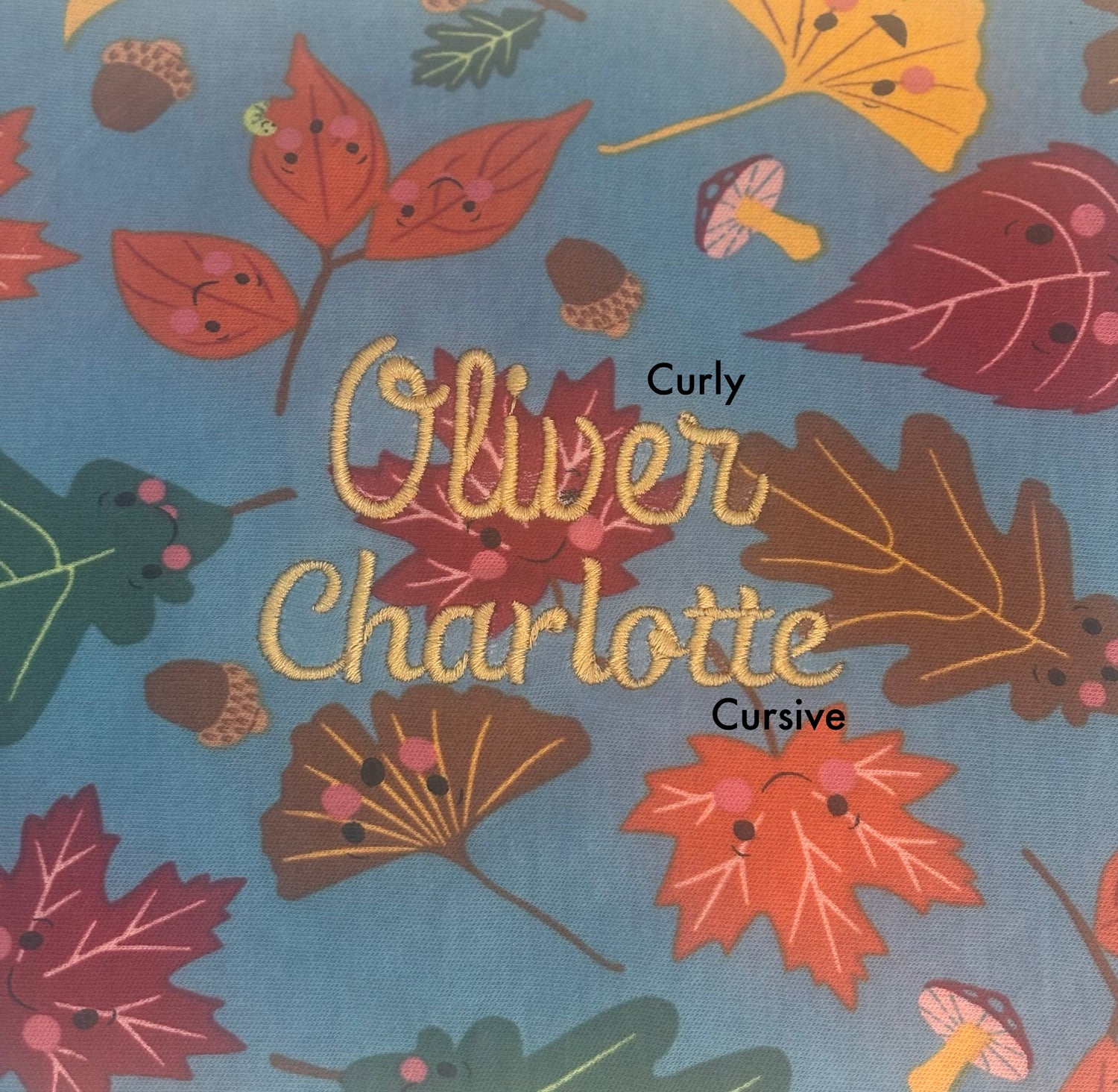 For hats, names are stitched in a single line. Placement is typically above the cuff so that you roll the hat cuff however fits baby.
