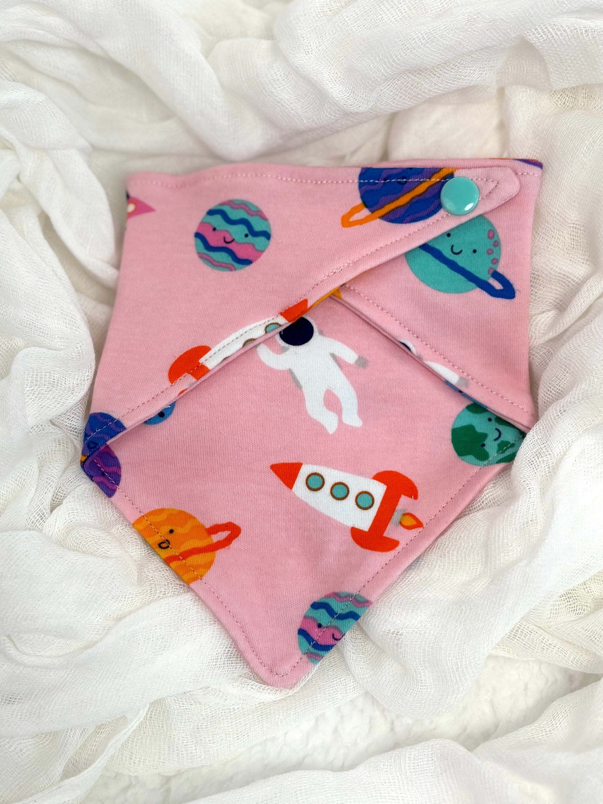 Note: Snap color on bibs is subject to availability and may not match the display item pictured. We do our best to match the best color to the fabric and our default pick is white.
