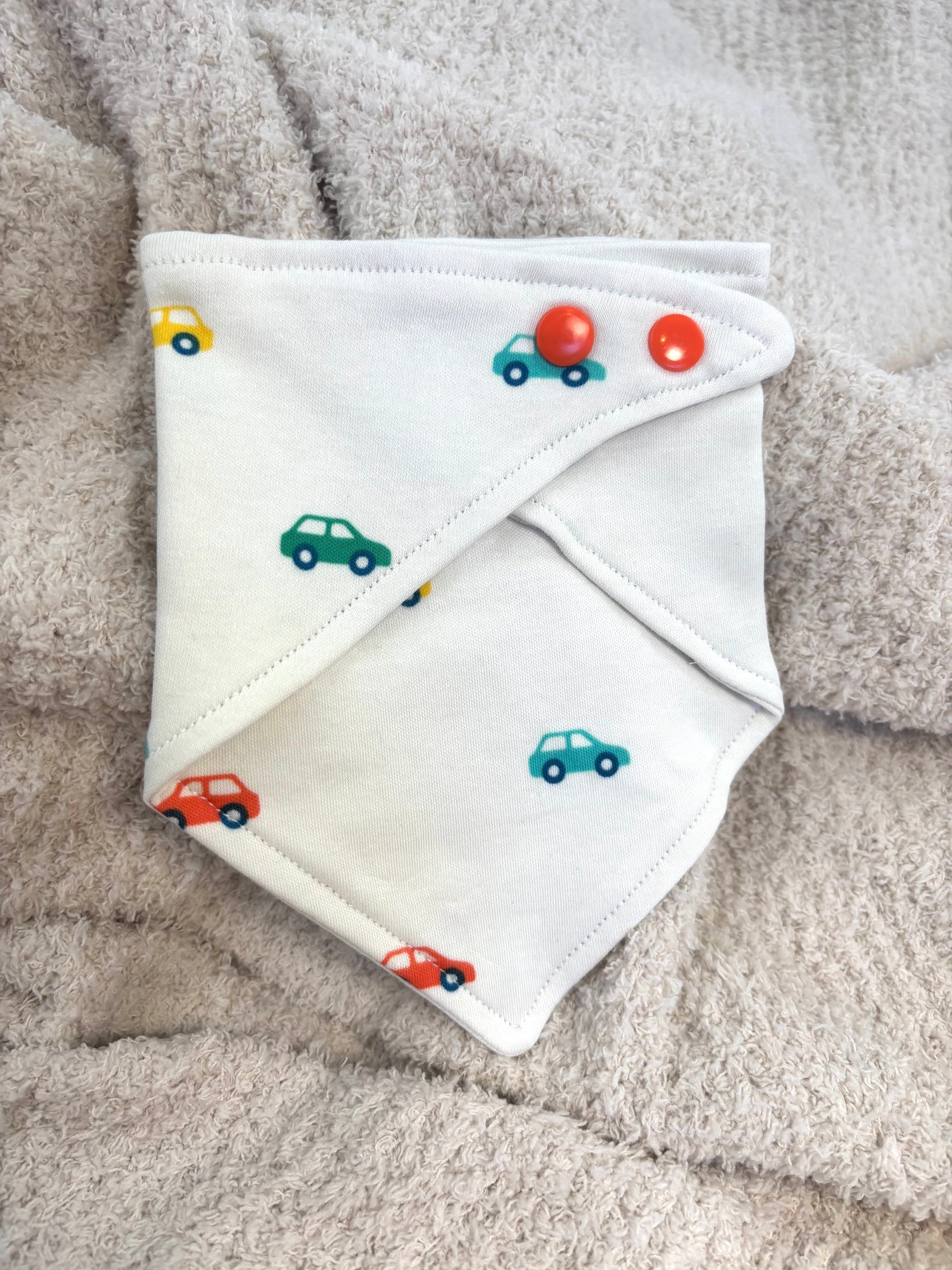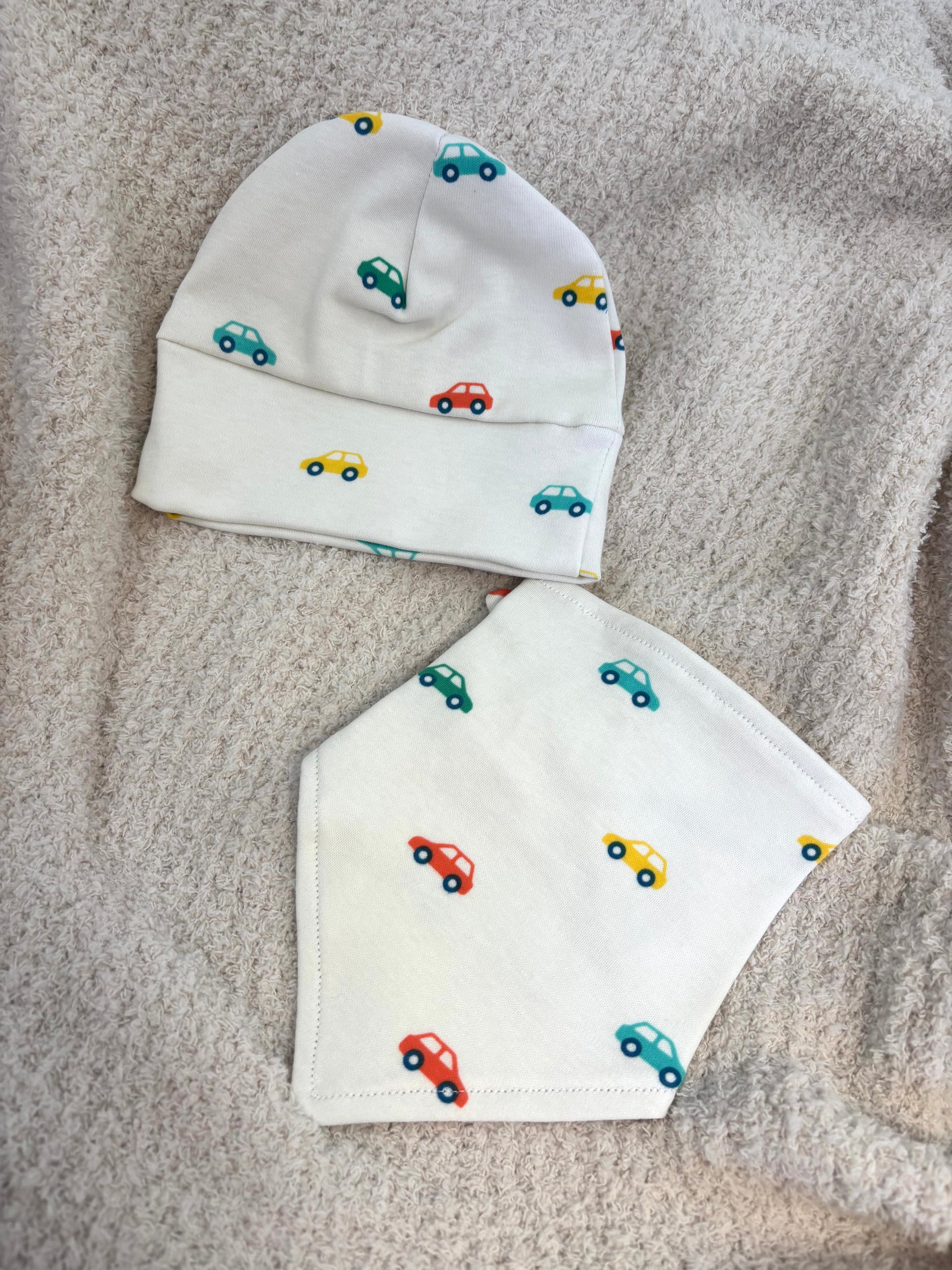 Our baby hats, designed for newborns up to three months, keep tiny heads warm and comfy with gentle knit fabric. Paired with our adjustable one-size bibs that adapt as your child grows from baby to toddler, this set features fun car and construction themes—ideal for catching spills for a little one who is surely always on the go themselves!